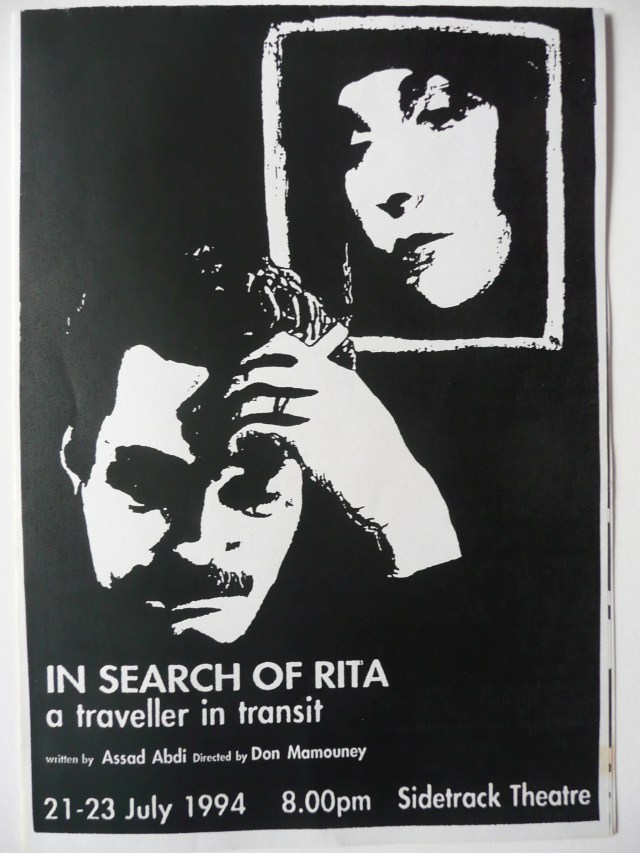 Programme (cover & inside), ‘In Search of Rita: a Traveller in Transit’, Sidetrack Theatre, 1994 Poster, ‘The Pessoptimist’, Sidetrack Theatre, 2005 Poster, ‘The Pessoptimist’, Sidetrack Theatre, 2005 PALESTINIAN AUSTRALIAN THEATRE 1994 In Search of Rita: a traveller in transit Written by Assad Abdi, 1991Produced at Sidetrack TheatreDirected by Don Mamouney Script archived Performed by: Maha […]