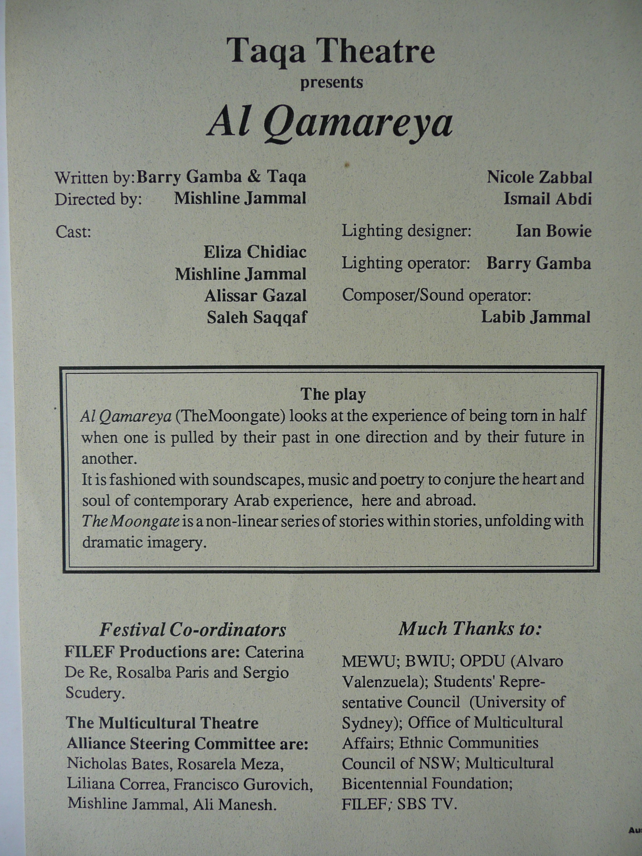 “TAQA Theatre was founded in late 1990 with the aim of developing innovative, contemporary Australian theatre with a strong Arab Australian perspective. TAQA’s first production, Al Qamareya (The Moongate) – performed in Sydney, Canberra and Wollongong throughout 1991 – was one of the first bilingual theatrical representations of Arab Australian experience.”