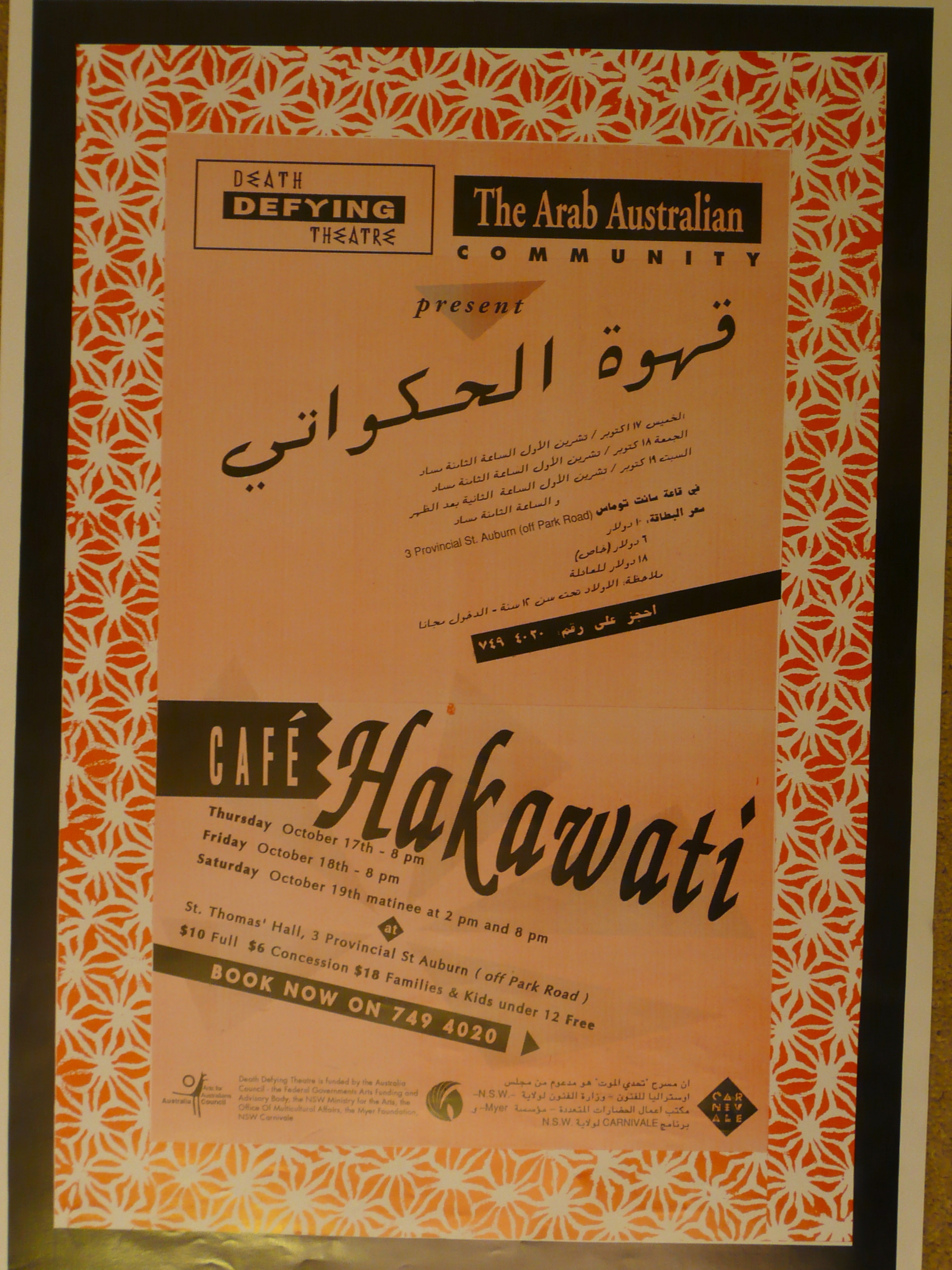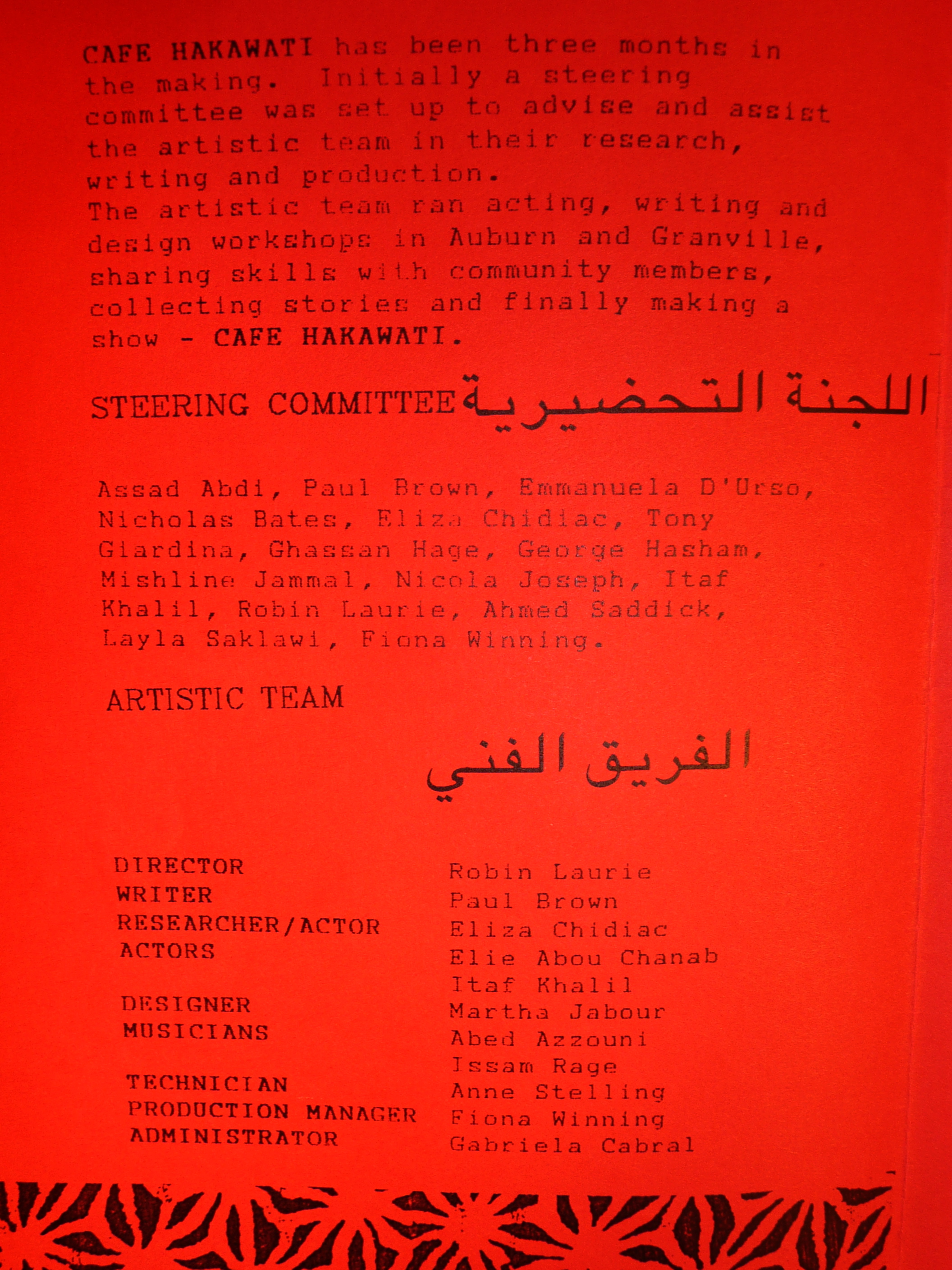 Café Hakawati was a ground-breaking community theatre process and production in Auburn, developed with local Arab Australian communities during the first Gulf War in 1991. As a speaker at the company’s 25th anniversary celebration in 2006, I remember saying that my involvement in Café Hakawati was personally significant, as it brought together previously schizophrenically separated parts of myself … my creative self, my political self and my Arab self.